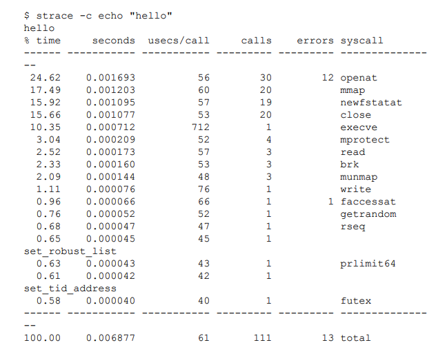 For example, even a simple command like using cat to print the word hello involves more than 100 system calls:
